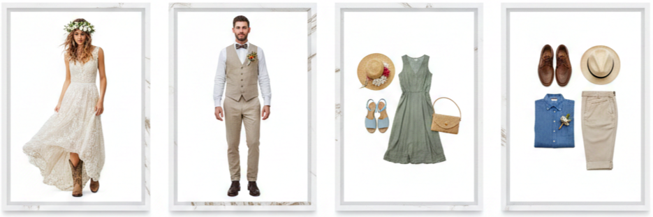 Grooms typically opt for vests, suspenders, linen shirts, and relaxed suits in earthy tones. Ties are optional, and boots or leather shoes suit the setting well.