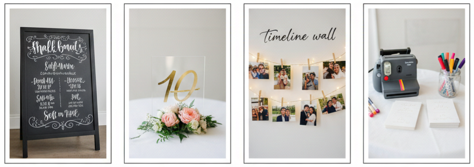 - Chalkboard Signs: Chalkboards work well for schedules, menus, or seating information. Hand-lettered designs feel casual and welcoming.