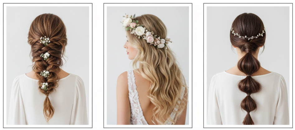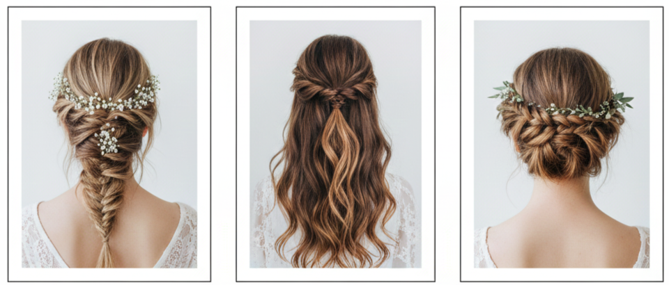 Brides often choose lace gowns, flowing silhouettes, or tea-length dresses that move easily. Cowboy boots, sandals, or flats replace traditional heels, making it easier to walk on grass or gravel. Floral crowns, loose hairstyles, and natural makeup complete the look.