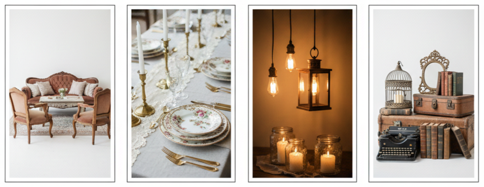- Vintage Details: Lace runners, old frames, crates, ladders, and antique furniture bring character and nostalgia.