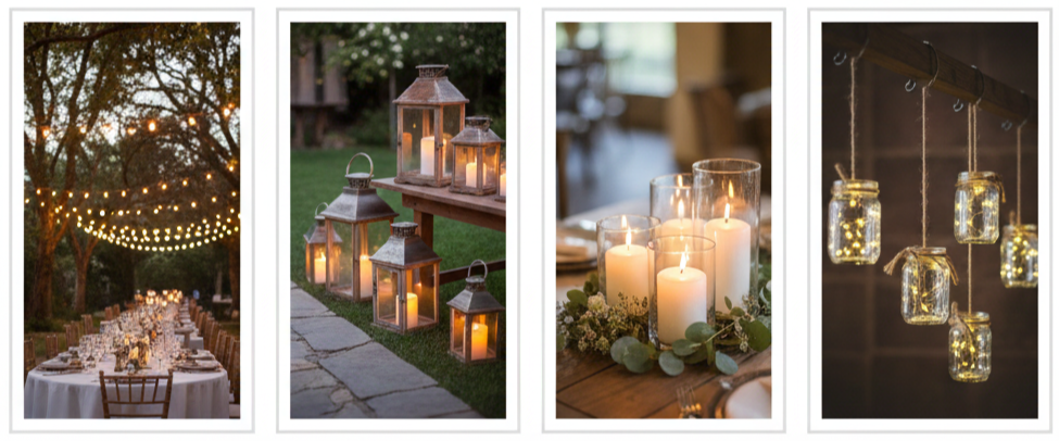 - Soft Lighting: String lights, lanterns, candles, and chandeliers soften large spaces and create a cozy atmosphere after sunset.