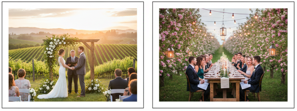 - Ceremony Locations: Open fields, beneath mature trees, beside lakes, or in front of barns create unforgettable backdrops. Minimal décor often works best, allowing nature to take center stage.