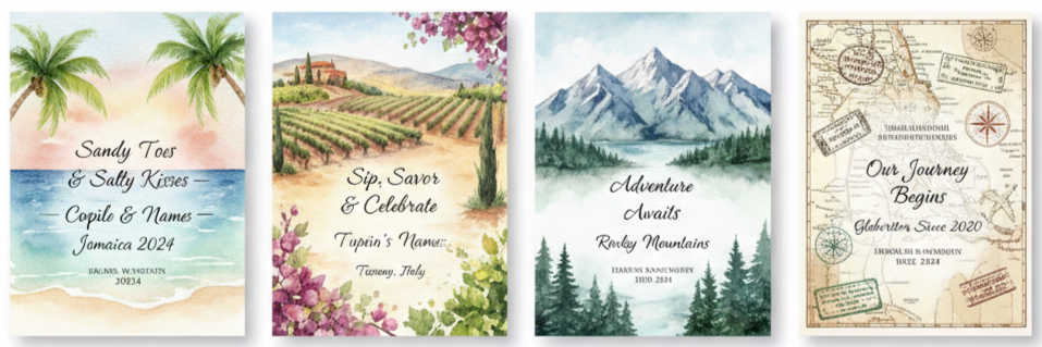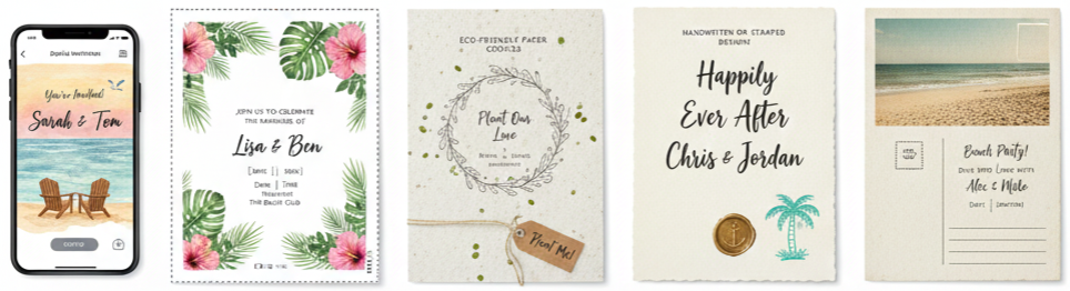 Invitations inspired by beaches, vineyards, mountains, or travel themes help guests connect with the wedding location.