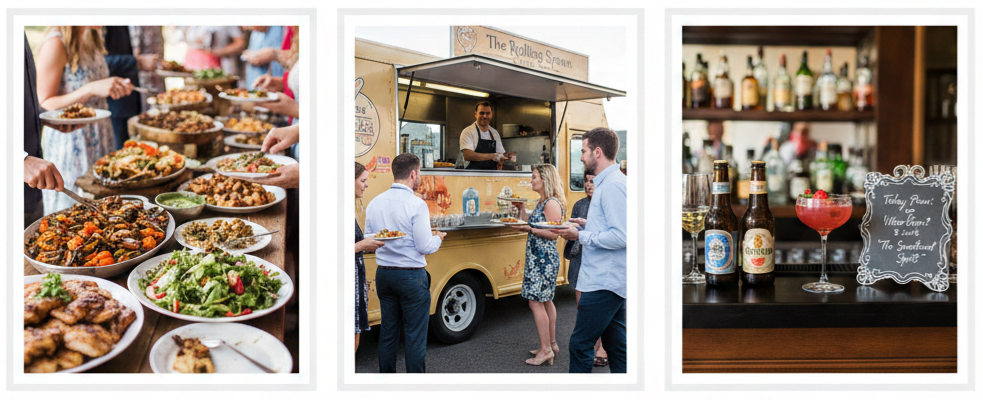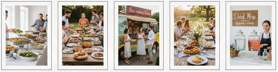 Go for casual, creative options like grazing tables, food trucks, plant-based buffets, or ethnic cuisine. It should feel fun, filling, and social—not overly formal.