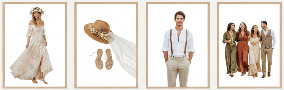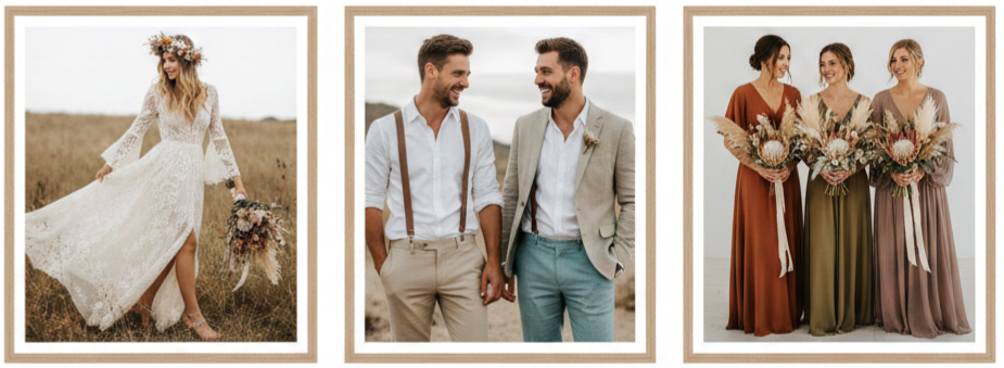 Guests usually feel most comfortable in semi-formal outfits made from breathable fabrics. Flowy dresses, floral patterns, neutral colors, and relaxed tailoring fit well with the boho vibe.