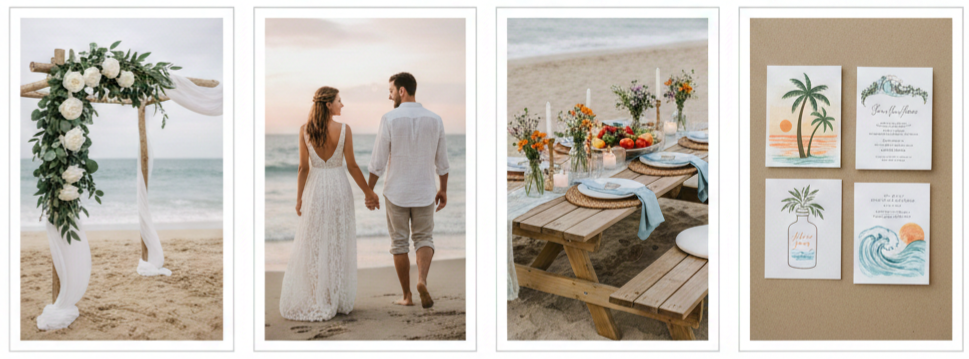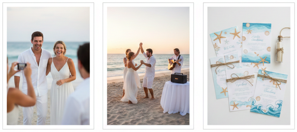 Decorating a beach wedding works best when you enhance what already exists rather than trying to transform the space. Simple, nature-inspired elements keep costs low while still feeling intentional and polished.