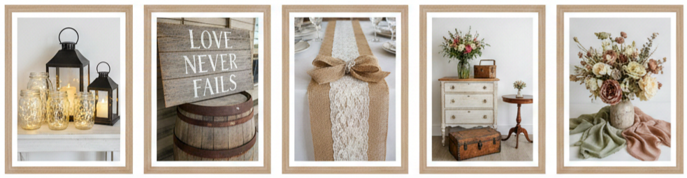 Kraft textures, woodgrain backgrounds, and lace-inspired details suit barn weddings and countryside celebrations.