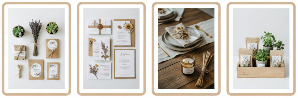 - Stationery Design: Invitations and signage usually feature natural textures, soft colors, and calligraphy. Dried florals, twine, or wax seals add subtle detail. Keeping the design consistent from invitations to menus and seating charts helps the event feel cohesive.