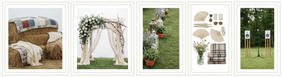 - Lighting Details: Battery-powered lanterns, candles in glass holders, and string lights create a warm mood for late-afternoon or evening ceremonies without requiring electricity.