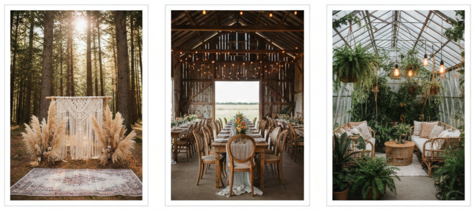 Not always. While outdoor venues fit the style well, indoor spaces with character—like barns or greenhouses—can bring the Boho vibe indoors. It’s all about using natural textures and mood lighting.