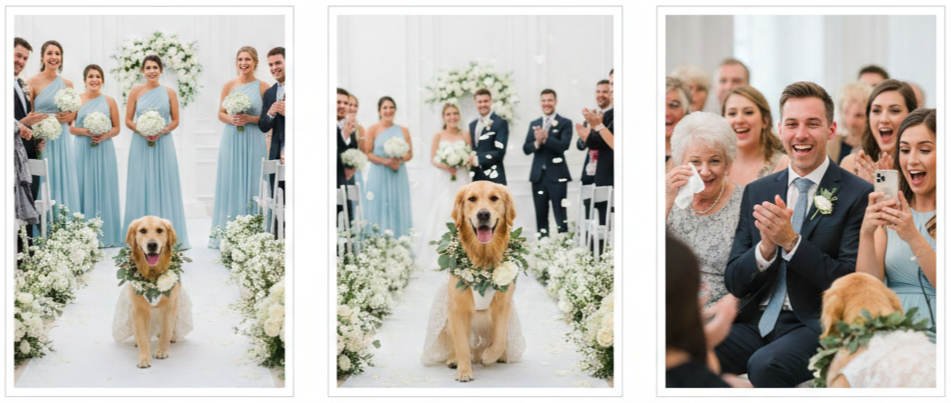 - Bouquets: Wildflowers, eucalyptus, dried palms, oversized blooms, trailing ribbons