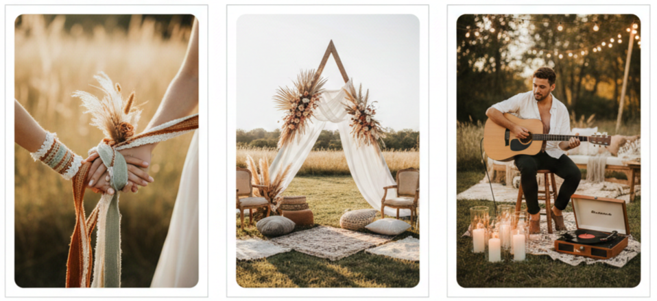 The venue sets the vibe for a Bohemian wedding. Outdoor spaces are popular, but the goal is to choose a spot that feels natural and inviting.