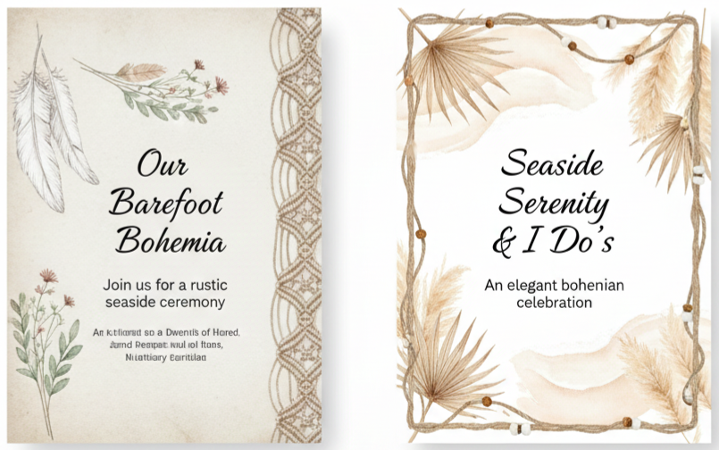 - Boho Invitation Design Elements: Many bohemian invitations feature hand-drawn florals, botanical illustrations, or celestial symbols like moons and stars. Watercolor backgrounds, soft textures, and organic layouts are common. These designs feel artistic rather than formal.
