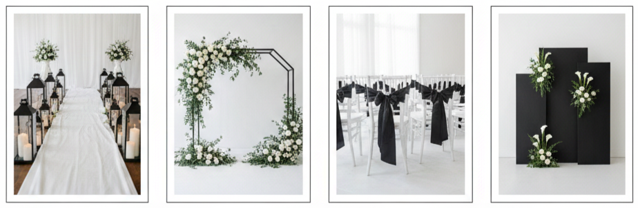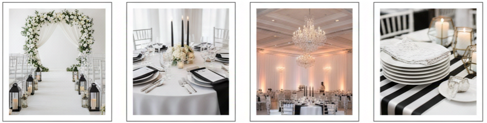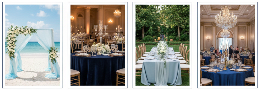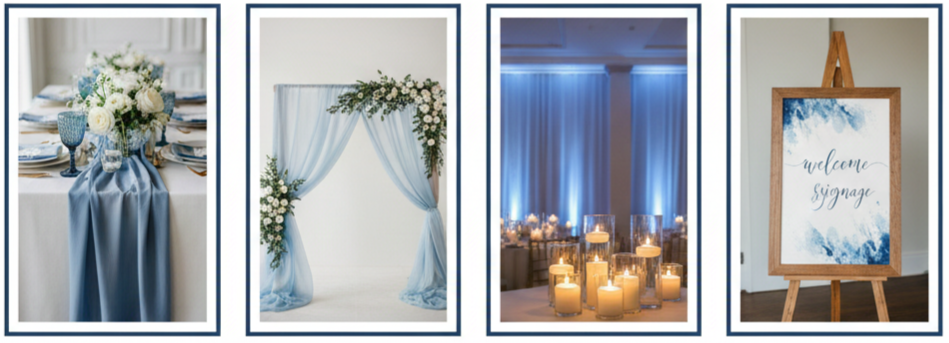 | Earthy Neutrals | Ivory, Sand, Clay, Tan | Table linens, backdrops |