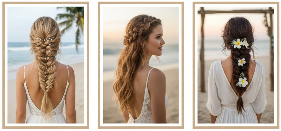 Braids are one of the best beach wedding hairstyle choices because they naturally resist wind and hold shape longer than loose curls. They also add texture and detail, which looks incredible in beach photos. Whether you want something boho, romantic, or modern, braids can fit the look.