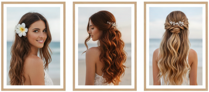 Not every beach bride wants their hair fully pinned up. Flowing hairstyles can look stunning against the ocean backdrop, especially when you’re aiming for a softer, more natural style. The key is choosing a “down” look that still has a plan for wind. We want movement, not chaos.