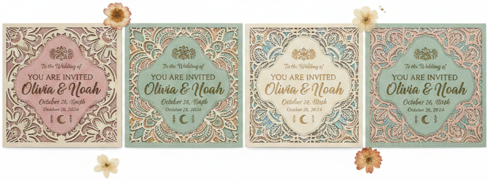 The carved detailing adds another layer of meaning. Carving reflects effort, precision, and craftsmanship. It’s a design that communicates care and thoughtfulness without needing any extra words. Instead of being overly trendy, carved invitations tend to feel timeless because the detail is created through structure rather than print alone.