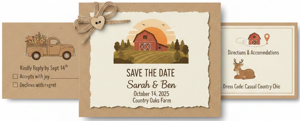 - RSVP cards and inserts: Add cards for RSVP, directions, accommodations, or additional events, all in the same style.