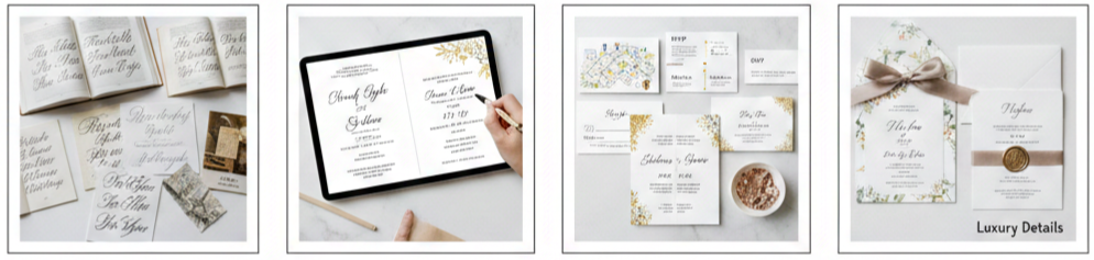 - Finish Options: Matte, shimmer, and velvet-touch options that change the feel and tone of the invitation.