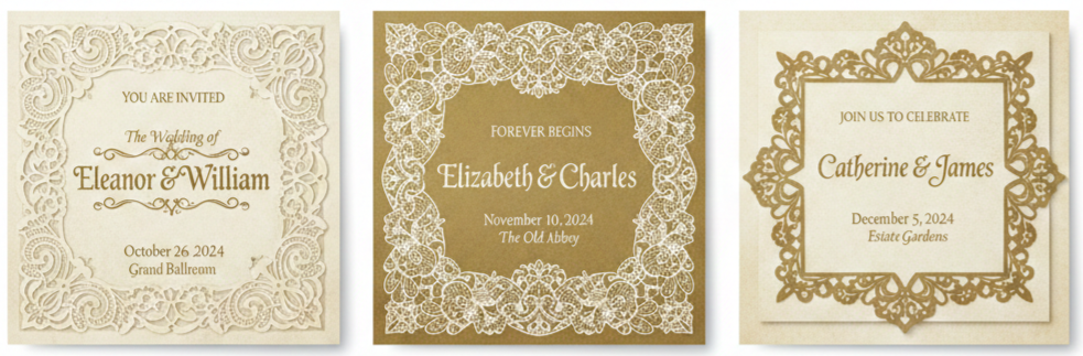 Couples planning a formal ballroom wedding usually love this design because the carving feels regal and structured. Couples with rustic themes usually choose botanical carving patterns paired with softer earth tones. Vintage weddings pair well with lace-style carving and warm metallic foils. Minimalist weddings can keep the carving clean and simple while focusing on typography.