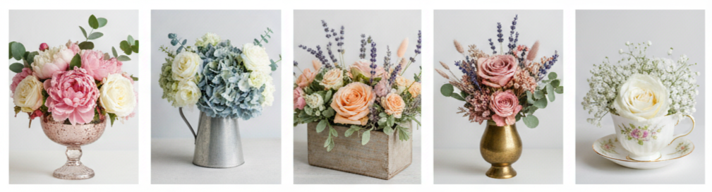 - Florals: Choose loose, natural arrangements with peonies, roses, or baby’s breath in faded tones. Add greenery for texture and movement.