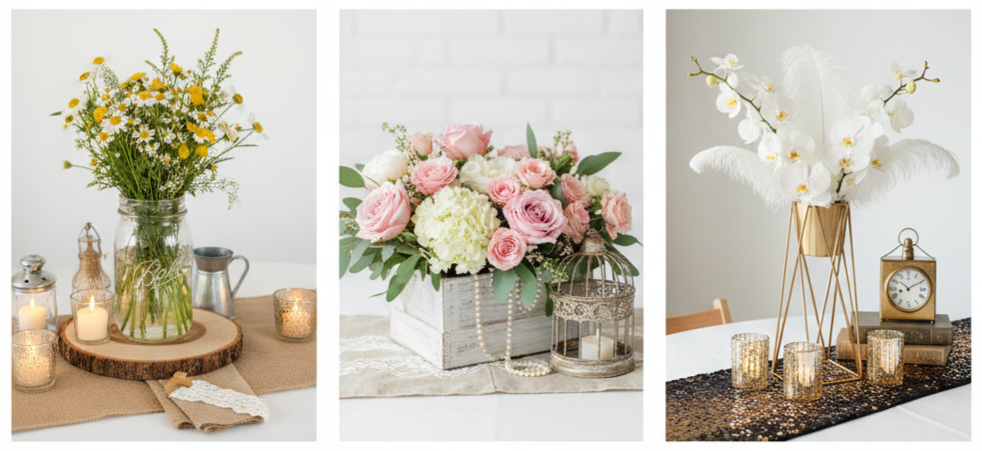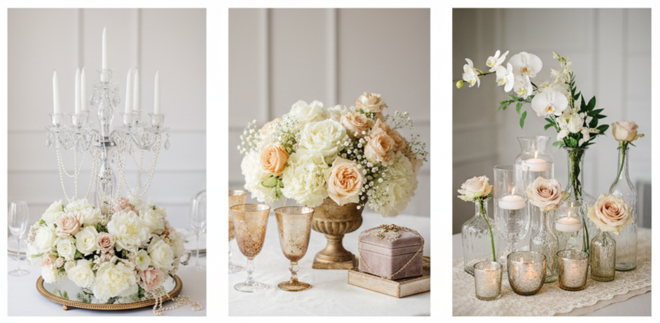 | Victorian | Ornate, floral, regal | Blush, mauve, gold | Candelabras, florals, lace |