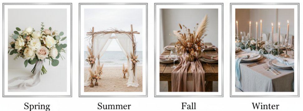| Spring | Cream, Blush, Sage, Pale Gray | Dusty Blue, Soft Green | Garden or Vineyard |