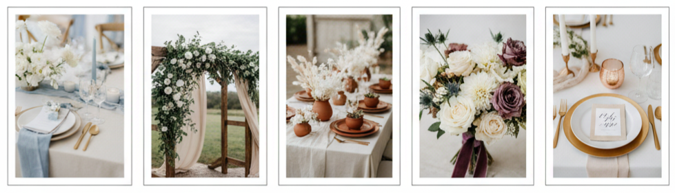- Use mood boards: Pull together photos, fabric swatches, floral examples, and décor ideas to see how everything works together before committing.