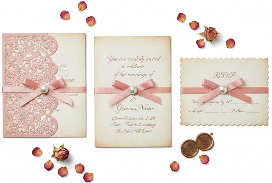- Wedding Attire Ideas: Pair lace details, soft fabrics, vintage hairpieces, or rustic accessories with the invitation’s aesthetic. For the groom, tweed details, suspenders, or neutral tones match the style well.