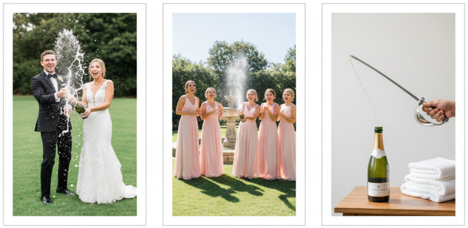 - How To Keep It Clean: We can keep towels nearby or use a champagne bottle specifically for photos so you don’t waste the good stuff meant for the toast.
