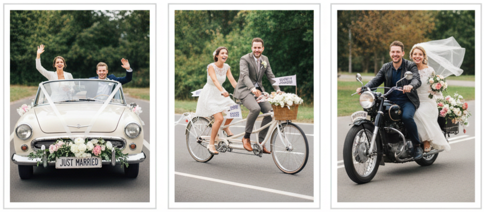 - How To Make It Photo-Worthy: We can decorate it with ribbons, florals, “just married” signage, and a few playful details that match your theme.