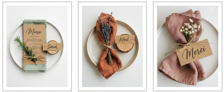 Kraft paper menus printed in a simple calligraphy-style font fit perfectly into a rustic theme. Place them on plates and add cloth napkins in earthy tones like sage, terracotta, dusty rose, or cream. Tuck in a small herb sprig, like rosemary or lavender, tied with twine for a clean, natural detail. For name cards, small wood slices or mini tree stump holders add a charming rustic touch that also works as a keepsake.