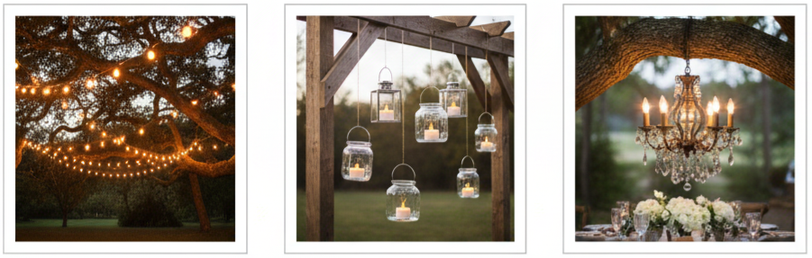 Hanging string lights from tree branches creates instant woodland magic. Glass lanterns, hanging mason jars with battery tea lights, or even a small chandelier adds a fairytale vibe that photographs beautifully. If your ceremony runs into the evening, this lighting turns the space into a glowing, intimate scene that feels unforgettable.