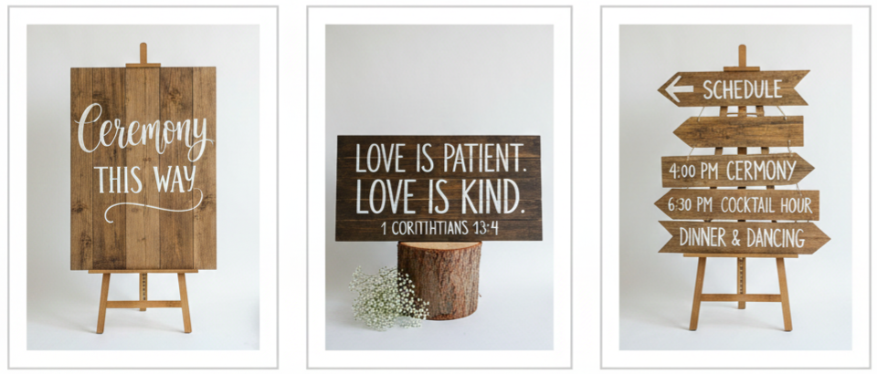 Rustic wooden signs can guide guests while also adding personality. You can use them to direct guests toward the ceremony, share a short quote, show the schedule, or display seating instructions. Reclaimed wood boards with white lettering or chalk-style writing look clean and timeless. Place them on easels or lean them against tree stumps for an effortless feel.