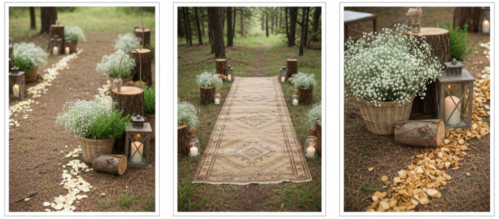 Instead of covering the aisle, use the natural ground as part of the design. Line the path with logs, lanterns, potted herbs, or baskets filled with baby’s breath. Adding dried petals works well too, especially if you want soft color along the walkway. For extra charm, vintage rugs in earthy tones can create that laid-back woodland look without feeling too staged.