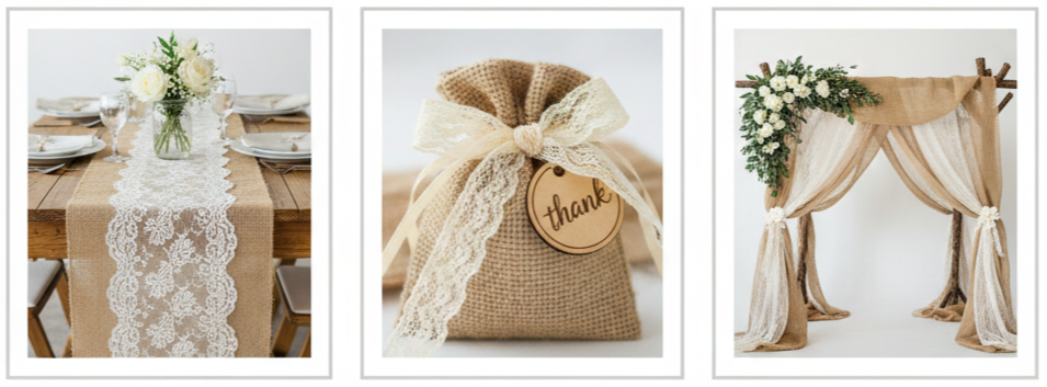 Burlap runners keep the design grounded, and lace adds softness without taking away from the rustic theme. We suggest sticking with neutral lace, like ivory or beige, so it blends into the tablescape and doesn’t compete with your florals or place settings. This combination gives you the best of both worlds: rustic charm with a romantic finish.