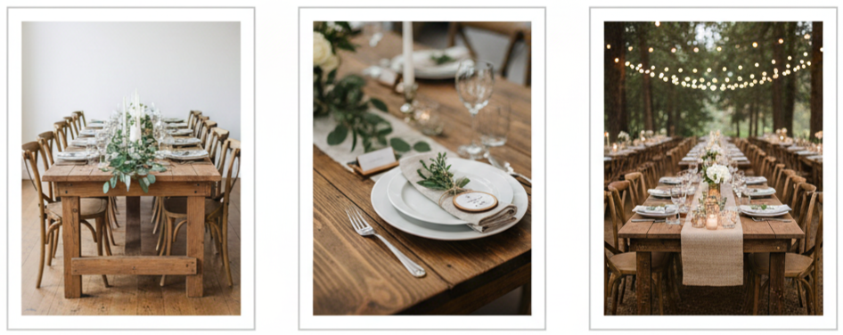 Rustic decor looks elevated when you mix raw textures with refined details. Pair wood and burlap with soft florals, warm lighting, clean place settings, and neutral color palettes. Keeping everything balanced makes rustic styling look intentional rather than messy.