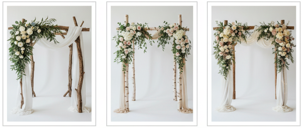Start with a wooden arch made from reclaimed wood, birch branches, or natural timber. Then drape it with fabric like muslin or soft tulle so it flows naturally. We recommend layering greenery like ivy, ruscus, or eucalyptus for volume, then adding floral clusters to tie in your color palette. You can keep the florals concentrated in one corner for a more relaxed and modern look, or make it symmetrical if you want it to feel more formal.