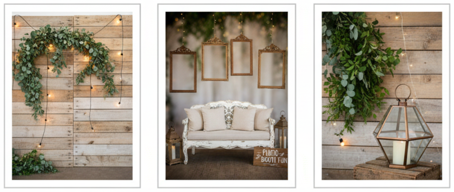 A rustic photo corner gives guests something fun to do while also creating more photo opportunities. A pallet wall with greenery and string lights works well for a backdrop. You can add vintage frames hanging from hooks, a rustic loveseat with neutral pillows, and simple props like lanterns or wooden signs. Keeping the decor neutral ensures the photos look timeless and not overly trendy.