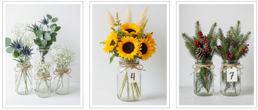 Mason jar centerpieces are one of the simplest DIY options. You can decorate jars with twine or lace, fill them with seasonal flowers, and group them in sets of three for a full centerpiece look without needing expensive arrangements.