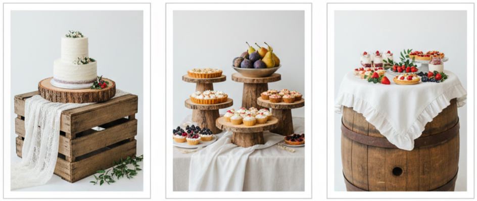 A rustic dessert setup can look stunning without being complicated. Display the cake on a wooden barrel, stacked crates, or a thick tree slice. Add layered dessert stands made of wood and decorate with seasonal fruit like berries, pears, or figs to keep everything looking fresh and natural. Draping linen or lace beneath dessert trays adds texture while keeping the style consistent.