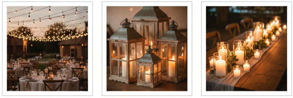 Lighting is what makes the reception feel magical once the sun goes down. String Edison bulb lights overhead for that barn-like glow, then add lanterns and candles down the center of the tables for extra warmth. Keeping candles unscented helps avoid overpowering dinner aromas while still giving you that soft flicker that makes everything feel intimate.