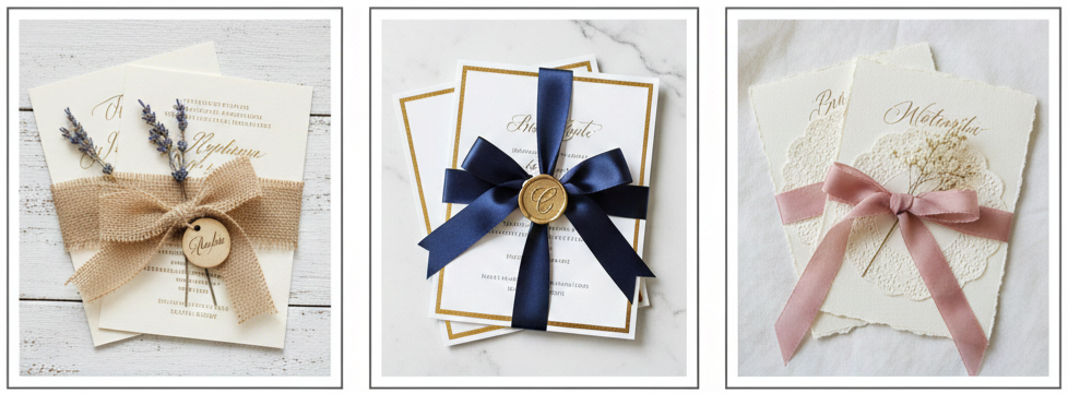 A popular middle option was ordering professionally printed invitations, then adding ribbon details at home. This gave couples a professional base design with the added charm of a handmade finish.