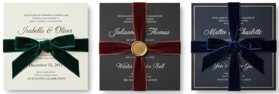 For formal weddings, satin or velvet ribbons in deep colors like navy, black, or burgundy looked sleek and polished. These invitations often featured foil stamping, thick cardstock, and refined typography.
