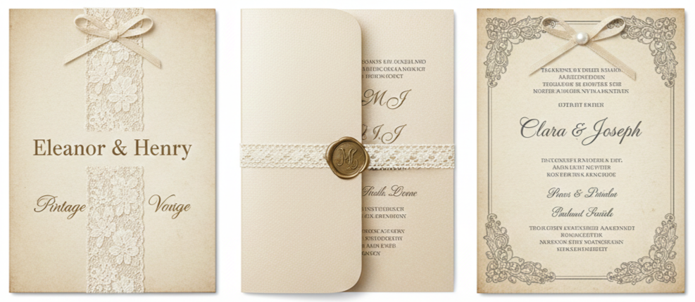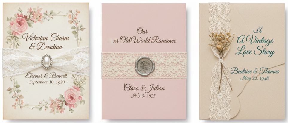 Lace ribbon paired with antique paper tones and vintage fonts created invitations that felt nostalgic. Many couples leaned into old-fashioned charm through delicate textures and classic colors like ivory and champagne.