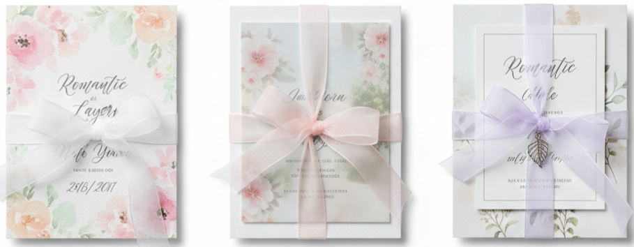 Soft layered invitation suites were a favorite for garden weddings and spring celebrations. Organza ribbons tied over watercolor florals, pastel prints, and dreamy layouts created a light and romantic feel.