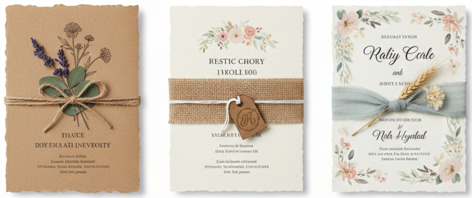 Rustic ribbon invitation styles focused on natural textures. Twine, burlap, and kraft paper were paired with soft florals, deckled edges, and sometimes even dried herbs. This style felt warm and handmade, which was exactly what many couples wanted.