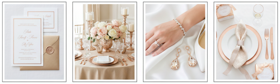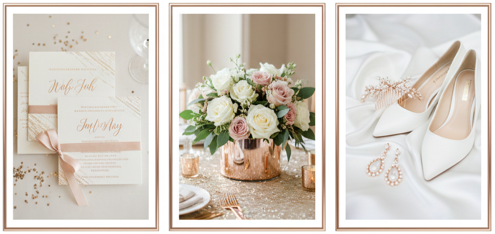 Rose gold and champagne tones made their way into invites, centerpieces, and even bridal accessories, adding sparkle without overdoing it.