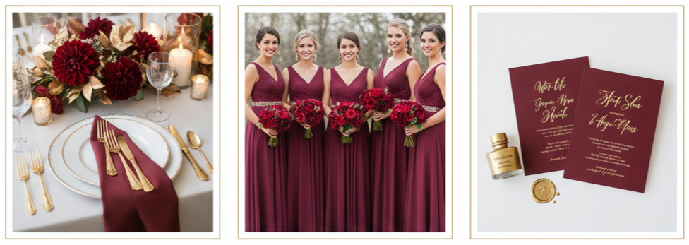 - Style details: Bridesmaids wore Marsala dresses accented with gold jewelry or belts. Floral arrangements included burgundy dahlias and deep red roses alongside gold-painted leaves or vases.