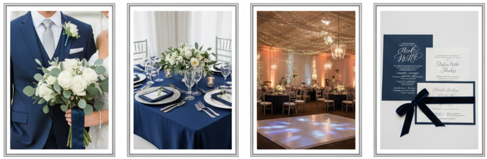 - Style details: Grooms chose navy suits with silver ties or cufflinks, while brides wore silver accessories or incorporated navy ribbon into their bouquets.